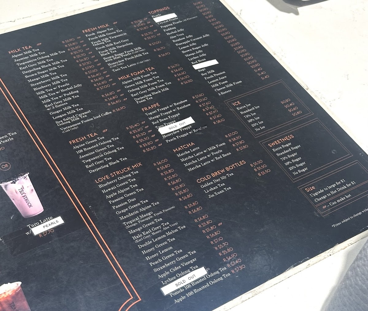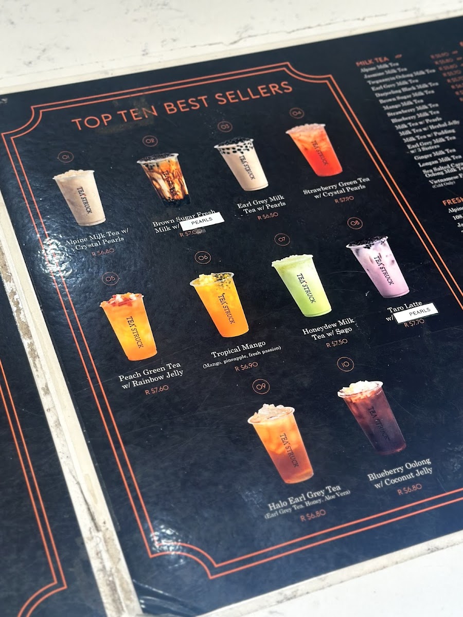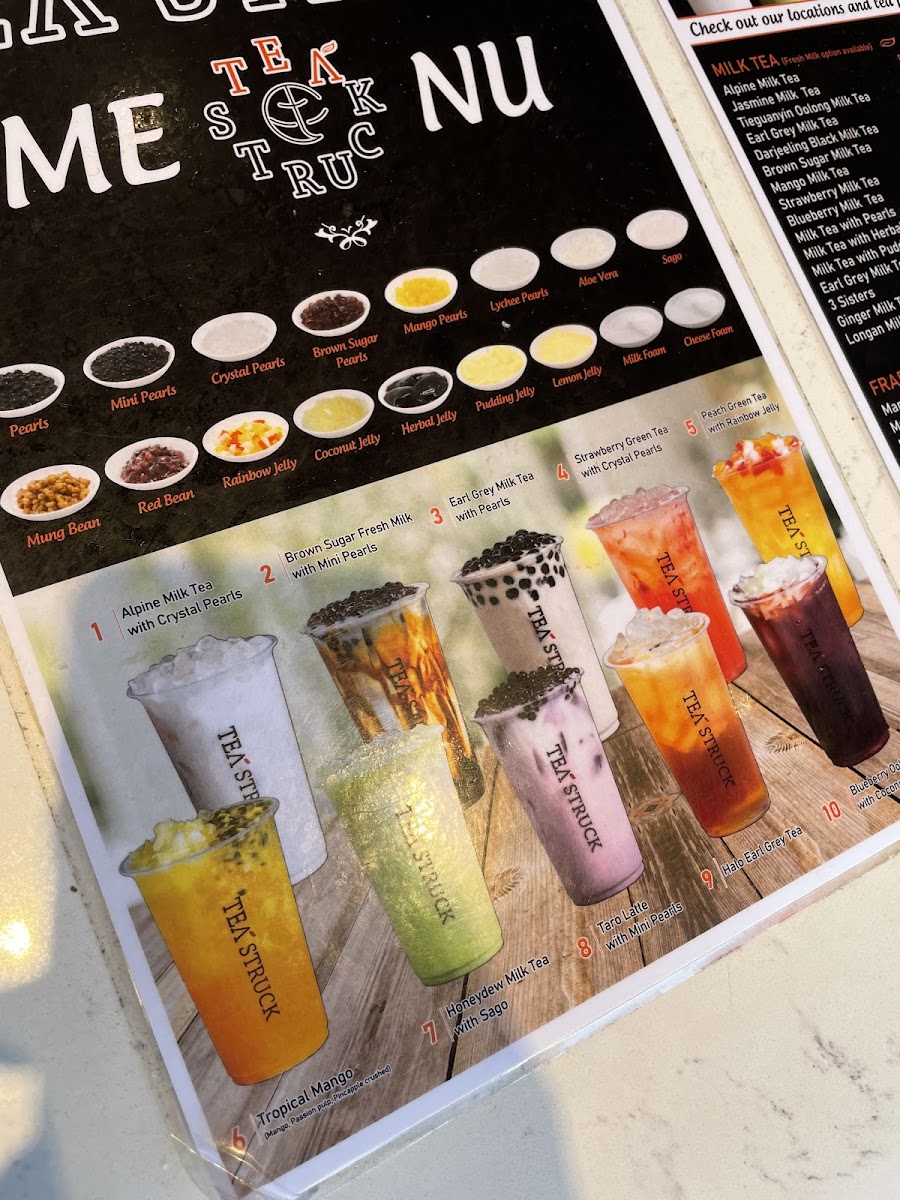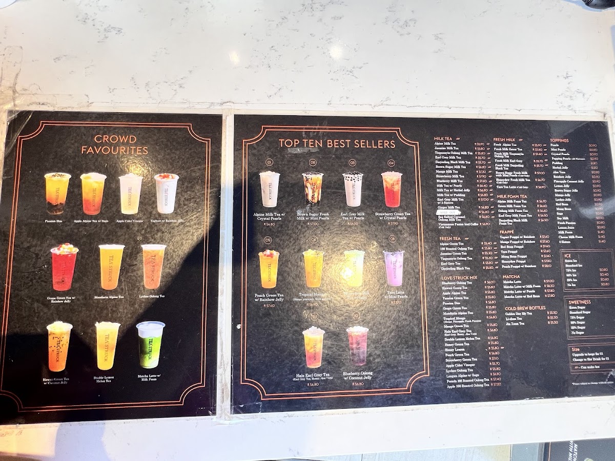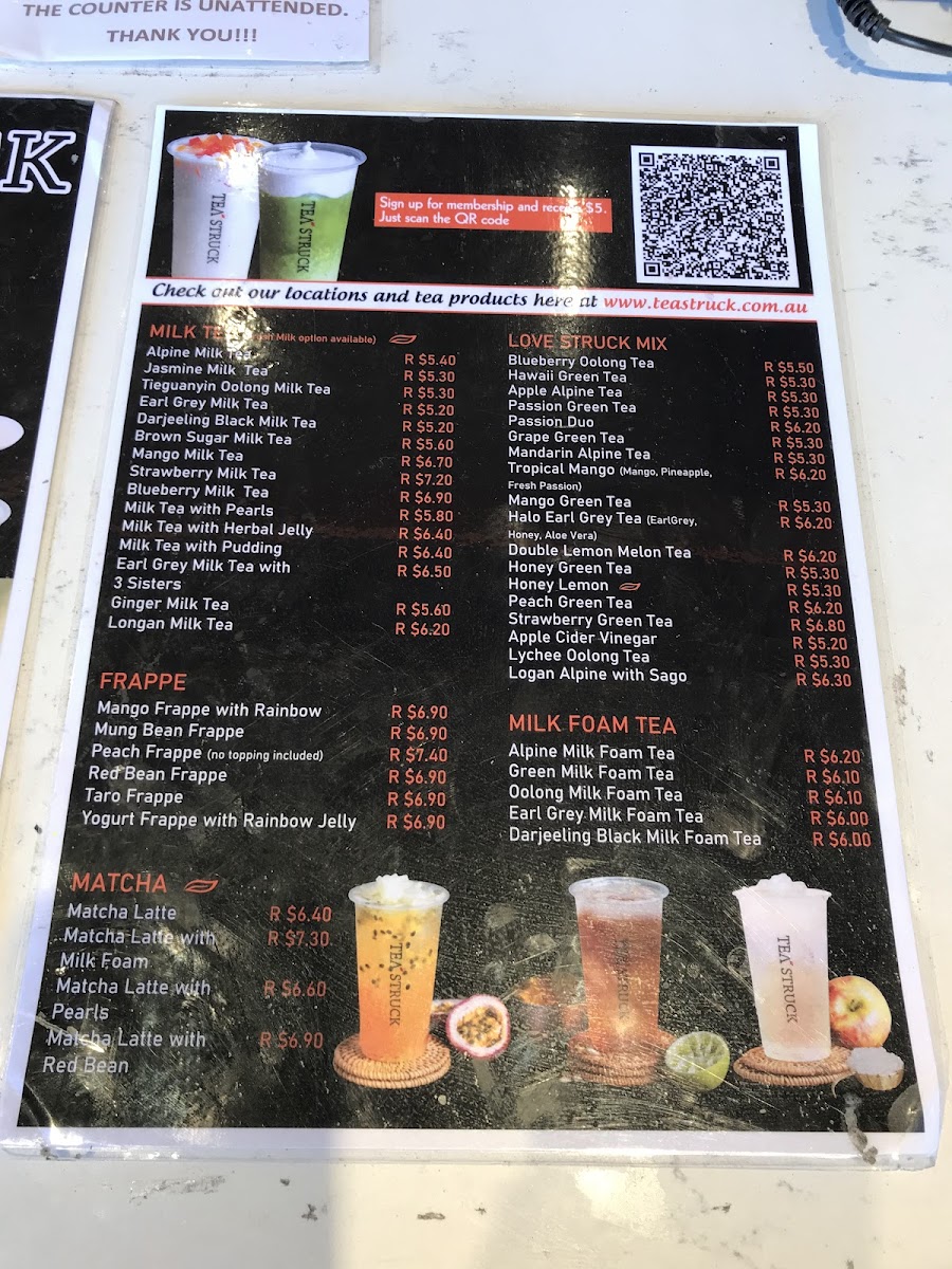 Tea Struck in Marrickville offers an extensive and vibrant menu, perfect for any tea lover. The Milk Teas are a crowd favorite, featuring unique flavors such as Longan Milk Tea and Mango Milk Tea. For those who enjoy a twist, there are options like Milk Tea with Pudding or Milk Tea with Pearls, providing an extra layer of texture and flavor. The Mains section includes refreshing options like Tropical Mango and Strawberry Green Tea with Crystal Pearls, alongside the comforting Earl Grey Milk Tea with Pearls. If you’re in the mood for something lighter, the Fresh Milk options, including the Fresh Milk Earl Grey Black Tea and Fresh Milk Green Tea, offer smooth and creamy beverages. For a more indulgent experience, the Milk Foam Tea section boasts delightful drinks such as Tieguanyin Milk Foam Tea and Alpine Milk Foam Tea, combining rich flavors with a creamy top layer. The Love Struck Mix features fun and fruity blends, such as Tropical Mango and Passion Green Tea, ideal for those looking for something vibrant. For a cold treat, the Frappe menu offers refreshing options like the Peach Frappe and Mango Frappe with Rainbow, perfect for a warm day. Fans of Matcha will appreciate the Matcha Latte with Pearls and Matcha Latte with Milk Foam, offering a delicate balance of flavor. For those who prefer classic teas, the Fresh Tea menu has elegant options like Alpine Green Tea and Darjeeling Black Tea. Finally, the Cold Brew Bottles bring a unique selection with options such as Jin Xuan Oolong Tea and Li Shan Tea, perfect for tea enthusiasts seeking a more refined option. With such a wide variety of choices, Tea Struck is a must-visit for anyone in Marrickville craving high-quality, flavorful tea beverages.